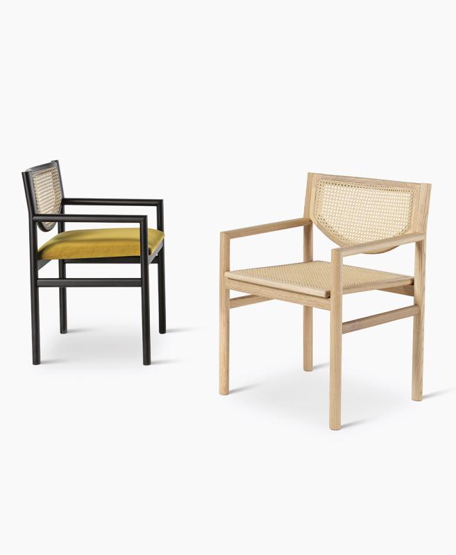 KLARA chair, with its timeless design, is presented in a new variant with a padded seat, upholstered in fabric or leather, in addition to the model in the collection featuring the timeless elegance of woven cane. Also available with matt lacquered frame.