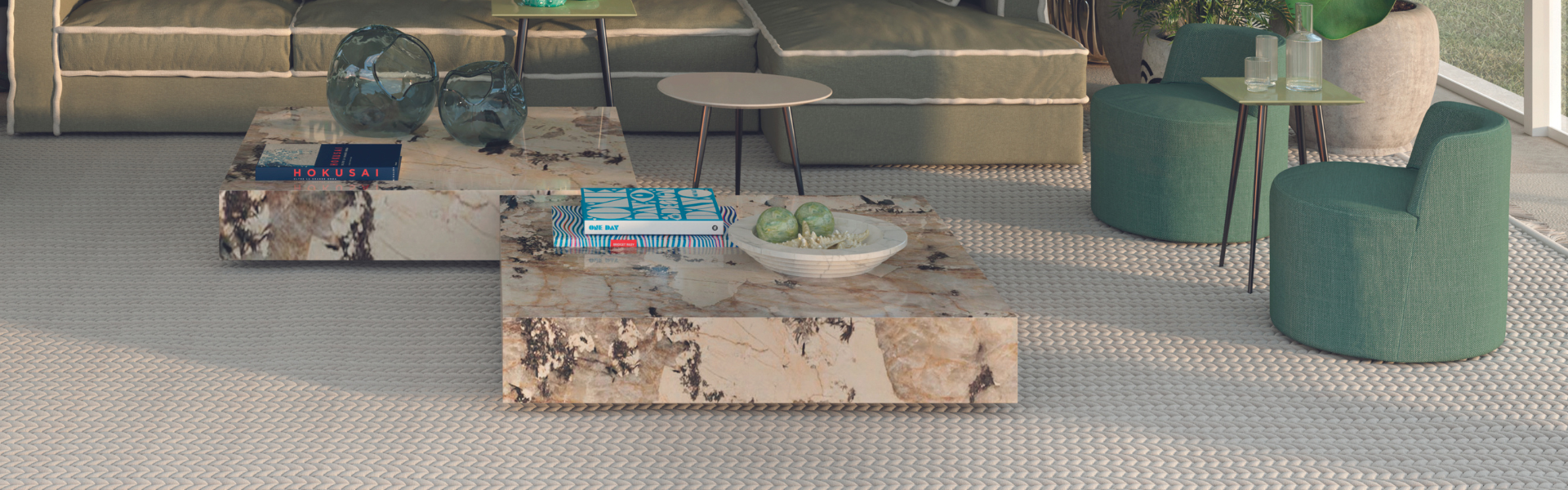 Tavolo basso moderno e sofisticato, impreziosito dal rivestimento in marmo pregiato, a scelta tra quelli della collezione.