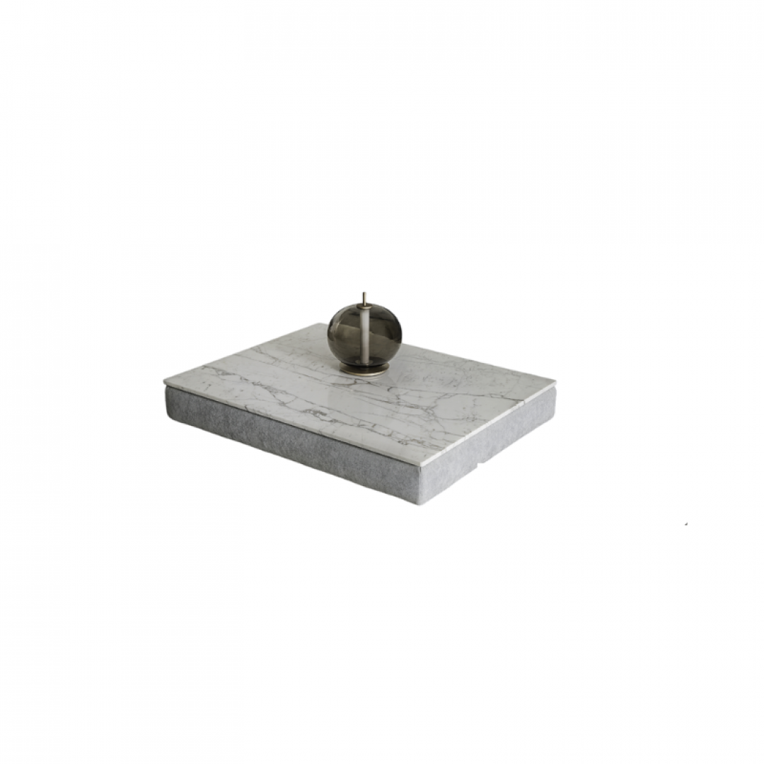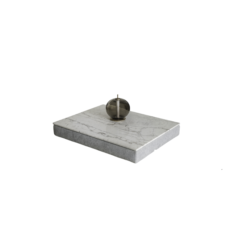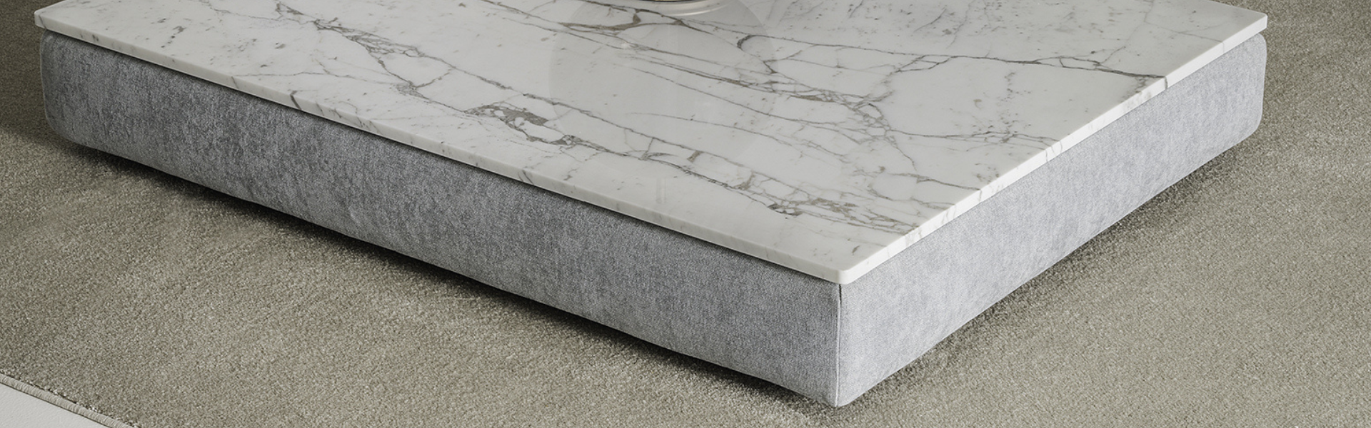 Tavoli bassi che ampliano la componibilità del divano, con base imbottita in tessuto o pelle, piano in marmo.